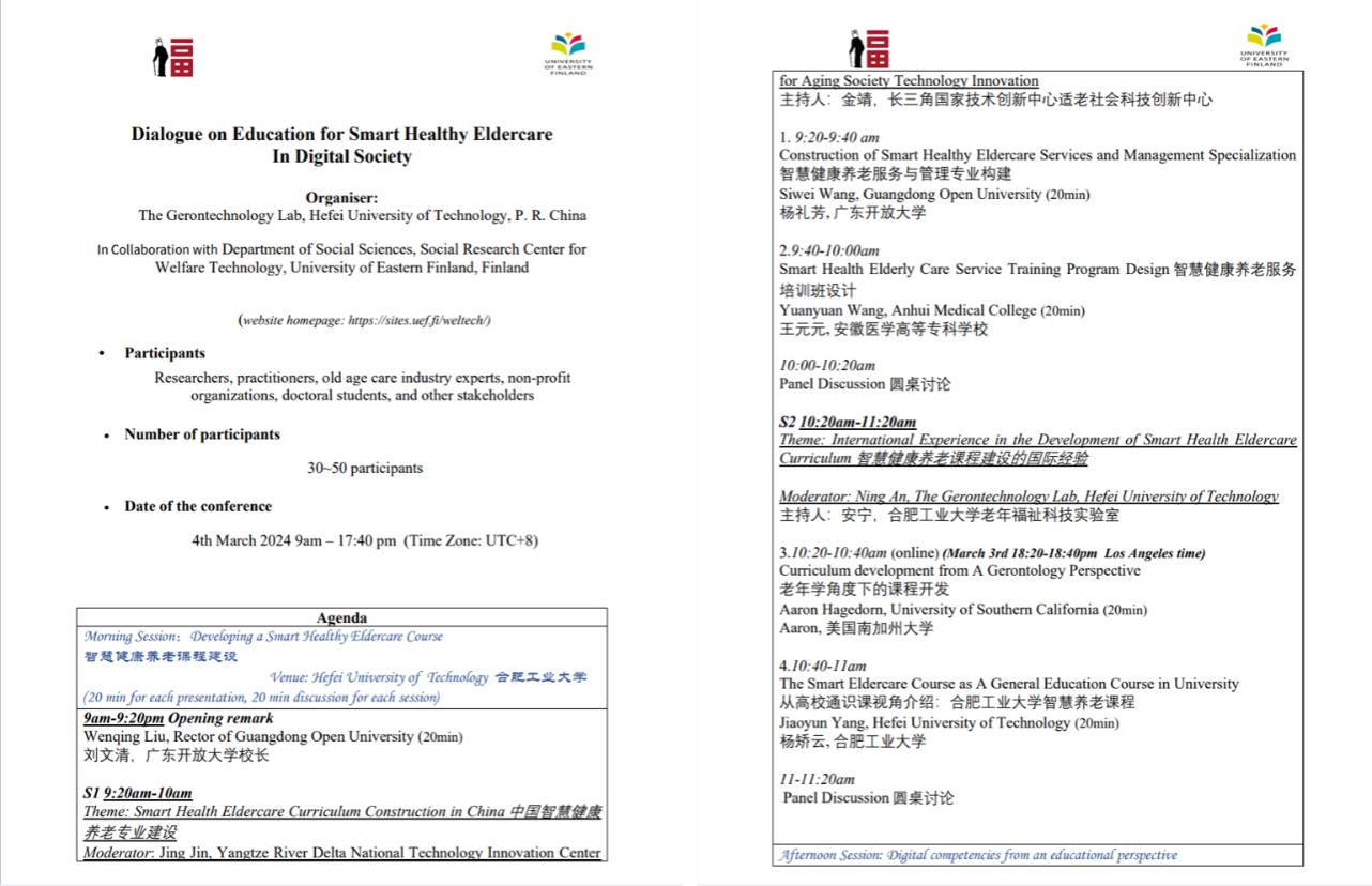2024年,基地主办了《对话:数字社会中智慧健康养老教育》(Dialogue on Education for Smart Healthy Eldercare In Digital Society)线上线上下混合国际研讨会,来自美国南加州大学、芬兰东芬兰大学、芬兰中央应用技术大学、芬兰坦佩雷应用技术大学、捷克奥斯特拉发大学、奥地利因斯布鲁克管理大学、合肥工业大学、南开大学、长三角国家技术创新中心适老社会科技创新中心、广东开放大学等十余所高校的专家参与了此次会议。