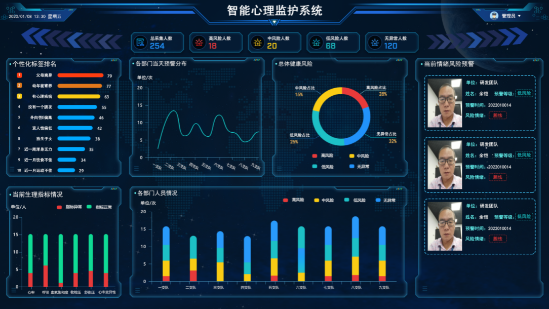 在通过网络监控摄像头及现有的网络基础设施对监护目标面部情绪、肢体动作等自动采集处理的基础上,基地与日本国立情报研究所、新加坡国立大学等合作,利用心理学理论和普适心理计算技术相结合,建立个体心理常模、群体心理常模、无感主动检测等技术。在此基础上,研发了智能心理监护,实现提前预警、及时关爱,为心理工作提供可量化的分析工具,为决策层全面掌握心理动态,做出正确引导、处置提供分析依据,提升对监护目标心理问题的发现、分析判断和关爱能力。